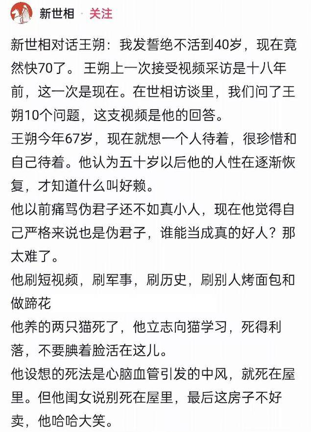 在采访中,王朔谈及了很多有关生死的话题,他曾发誓说自己绝不活到40岁,现在竟然快70岁了,如今的他很喜欢一个人待着,很珍惜和自己待着。